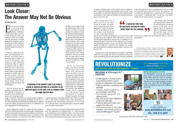 for Your Patients THE USE OF REHABILITATION PROCEDURES is becoming more of a mainstay within chiropractic health care. Core spinal musculature stabilizing exercises, proprioceptive training, as well as activities designed to enhance flexibility are currently being used to help support the chiropractic adjustment. Each of these methods has become a major point of interest to help a patient enhance his/her overall health and wellness. This has subsequently helped patients to be more involved in their health care by physically participating. There are a few things that we do well, and other things we do not do so well when creating a treatment plan. Are your rehabilitation programs designed to address postural deviations, improve strength, balance, sport specific or prevent injuries? Depending on the scopes of practice in the state you practice, the amount and types of rehabilitation the Doctor of Chi- ropractic is allowed to do will vary. For many doctors, the use of rehabilitative exercise, neuromuscular reeducation and therapeutic activities are of most importance. Others choose to use physical modalities to help increase healing time by improving circulation and decreasing edema. The choices you make are more than likely based on your state statute and, possibly, the chiropractic college you graduated from. The profession's approach to therapy maybe demonstrated as recently as 1935. When B. J. Palmer established the Rehabilitation Laboratory at the B. J. Palmer Chiropractic Clinic, all the equipment was patient driven. The only electrical piece of equipment used then was a mechanical horse. One of the rules at the clinic included, "At no time, in no way, do we use any therapeutic apparatus on any case." A common mistake many Doctors of Chiropractic make when developing a rehabilitation program for their patients is that they overload a joint before it has healed or full ranges of pain-free motion have been reestablished. This usually occurs by using a weight that is too heavy or of too high resistance. The difference between neuromuscular reeducation and strength training should be reviewed by many of us so that we are accurately performing therapy. Neuromuscular reeducation should be established prior to initiating strengthening protocols, especially if the patient is someone who appears to be physically fit and/or has a history of working out. The mistake of muscle strengthening before neuromuscular reeducation usually results in the patients' complaining that the exercise or activity you initiated aggravated their present condition or exacerbated an improving condition. Whether pain is present, either constantly or during an activity, it will prevent the body from performing normal moving patterns. To ensure this will not happen, the Doctor of Chiropractic must have a good understanding of the patient's present-time muscle strength and his physical endurance. This must be established through initial and interim chiropractic evaluations and management. Gait Cycle: Another commonly overlooked patient presentation is gait cycle. Evaluation of the patient's gait cycle can show muscle imbalances. These imbalances can occur from differences between antagonist and protagonist strength, flexibility, and the subluxation complex. One of the most frequent gait alterations that may be seen is the Trendelenburg gait. Clinically, this presents as a dropping of the hip on the unsupported leg during each step of the gait cycle. This usually results from a weakness of the gluteal musculature. Often this problem can be addressed and stabilized by reducing the subluxation complexes and initiating normal motor pattern movements, followed by strengthening exercises. Base of Support: Another area to observe would be the patient's base of support: Is it too narrow or too wide? Are the abnormalities within the gait due to neurological inducement, altered biomechanical dysfunction, or antalgic due to pain? Is the patient's posture in good alignment from head to toe? Keep in mind, postural defects and movement distortions in one area can affect seemingly unrelated distant areas, causing dysfunction and pain. Does the patient show an anterior translation of the head, rounding of the shoulders with thoracic extension, anterior pelvis translation, functional leg length inequality, and asymmetrical bilateral pronation? Continued on pg. 63 Establishing a Care Plan for Your Patients—by Kirk Lee, D.C. Continued from page 60 One of the most frequently missed patient presentations is how a patient raises and lowers himself from a seated position. How often has a patient said to you he is having difficulty raising and lowering himself from the toilet, difficulty maneuvering stairs and getting out of bed? Quite often, this is the result of weakened musculature and altered spinal biomechanics. Are the assistive devices (walkers, canes, crutches) being used properly, or are they a contributing factor? As the Doctor of Chiropractic, you routinely develop a plan for how you will provide the chiropractic adjustment. You do this from a correlation of your examination findings, which may include X-ray and other additional testing. It is important to have and implement a plan that may compliment the chiropractic adjustment with thorough rehabilitative techniques. Please remember, this is much more than merely handing your patients a bunch of exercises and expecting them to do them on their own. A 1980 graduate of Palmer College of Chiropractic. Dr. Kirk Lee is a member of the Palmer College of Chiropractic Post Graduate Faculty and Parker College of Chiropractic Post Graduate Faculty. He has lectured nationwide on sports injuries and the adolescent athlete, and currently practices in Albion, Michigan. He is very active with the Michigan Chiropractic Society, serving on the legal and government affairs committees. \