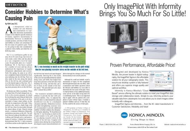 W HETHER WE ARE CONFRONTED WITH developing an exercise rehab program for a male patient (who is sedentary, overweight, and experiencing low back pain) or developing a strengthening program to fine tune a professional athlete, some emphasis must be placed on the core musculature. With today's marketing of the "infomercial." we have seen everything from machines that promise six-pack abs to cures for low back pain. Before we start any patient on a rehabilitation program, we must consider several things. It must be designed to improve flexibility and increase strength but not create overload or stresses on the musculoskeletal system. Too much stress can prevent the body from continuing to heal and repair and, ultimately, lead to an exacerbation of the patient's present injury or lead to a new injury. One of the easiest means of addressing core strength is through the use of exercise balls. A patient who has balance problems can achieve help from just sitting on the ball. Sitting on the pliable-moveable ball causes the stimulation and recruitment of the core muscles to maintain stability. Most balls come with a booklet of choice exercises. It is your job, as the doctor, to determine what activities best suit your patients' needs. Keeping in mind the importance of a good core muscular strength, another area of consideration must be focused around the hip or pelvic musculature. When we consider the biomechanics of walking and running we know that, during the stance phase or weight-bearing phase of gait, we have a sub phase called "mid-stance." During this sub phase of weight bearing, all the body's weight is placed on one leg at a time. It takes strong abductor muscles (gluteus minimus and medius) to maintain a level pelvis, while weakness in the muscles can allow a drop of the unsupported side. Weakness of these muscles could lead to repetitive stress and a familiar gait pattern called a "trendelenburg." The importance of maintaining a strong hip and/or pelvic musculature is clearly pointed out in a research study completed at the University of Calgary in 2007 by Dr. Reed Ferber, a professor in Kinesiology. During a seven-month period, they assessed 284 patients who entered his running injury clinic at the University of Calgary. The study showed that 92 percent of the patients demonstrated weakness within the hip musculature. Of those 284 patients, 89 percent showed marked improvement in four to six weeks from performing specific exercises to strengthen the hip/pelvic musculature. The exercises included hip abduction, hip extension and flexion, and external rotation. These were performed in a sequence of: Day one— 1 set of 10 Day two—2 sets of 10 Day three—2 sets of 10 Day four and after—3 sets of 10 He recommended performing these exercises for four to six weeks and then continuing two times a week thereafter to maintain the strength that was gained. HIP ABDUCTOR—STANDING Place foot not attached to the ex ercise band behind the leg that is attached to the band. Move leg attached to the band out ward, keeping the knee straight. Count two seconds going out and four seconds coming in, controlling the motion throughout. HIP FLEXOR—STANDING Place foot not attached to the ex ercise band beside the leg that is attached to the band. Move leg attached to the band for ward, keeping knee straight. Count two seconds going out and four seconds coming in, controlling the motion throughout. HIP EXTERNAL ROTATION-SEATED Move leg attached to the exercise band outward, then return to starting position. Keep knees together throughout the motion. Count two seconds going out and four seconds coming in. controlling the motion throughout. In his study, Dr. Ferbcr recommended using a two-second count while taking the leg out as well as bringing it in. I like adding the four-second count to allow an eccentric unloading of the muscle as you return the leg to the starting point. As you assess your patients' rehabilitation needs, remember to emphasize not only the core musculature but the hip and pelvic musculature as well for additional stabilization. A 19H0 graduate of Palmer College of Chiropractic. Dr. Kirk Lee is a member of the Palmer College of Chiropractic Post Graduate Faculty and Parker College of Chiropractic Post Graduate Faculty. He has lectured nationwide on sports injuries and the adolescent athlete, and currently practices in Albion, Michigan. Dr. Lee can he reached at kalee(ii>shcglohal.net.