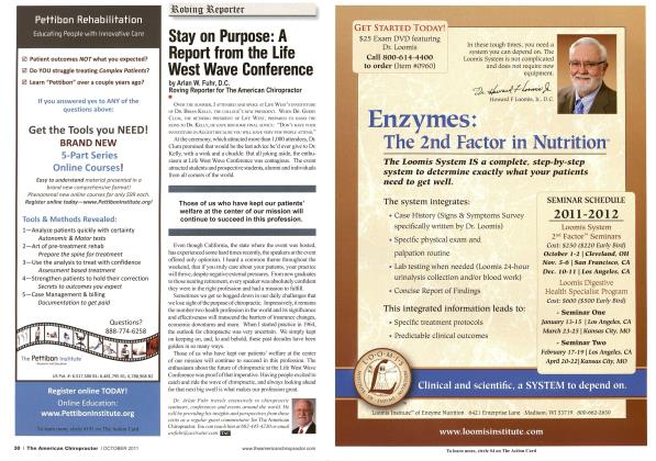 Co-founder and CEO, Activator Methods International ¦ I rixrntly ai ii:ndi:d him Association oi Chiropractic Colleges' an- NIA1. RlSRAKCII AciRNFJA CoNFF.RRNCF. (RAC) in Las Vixjas. The conference, which focused on the relationship between chiropractic and public health in the 21st century, attracted a multi-disciplinary collection of healthcare professionals coming together to explore the latest research findings. While at the conference and appreciating the broad array of expertise in the audience. I remembered a time when I passed judgment on chiropractic physicians like Dr. Scott Haldeman, Dr. Bill Meeker and Dr. Bob Mootz. Years ago. 1 thought they were absolute traitors for attending multidisciplinary conferences like RAC, and now I'm grateful to them for setting an important precedent. By pioneering involvement and interaction among all healthcare professionals, those doctors helped open doors for all of us. Today, participating in conferences like RAC continues to be a key method for expanding knowledge, by exposing ourselves to the experiences of academic and medical professionals and helping those same professionals better understand the value of chiropractic. While 1 am pleased with the progress we have made, some of the presentations at RAC demonstrated that we still have a long way to go to fully integrate chiropractic into the mainstream healthcare landscape. In one of the presentations, an allopathic physician touched on how to categorize someone experiencing low back pain. He identified two categories—acute back pain and chronic back pain—and. from what I could ascertain, acute was considered intermittent, and chronic was viewed as a state of mind. His assessments admittedly frustrated me. I felt compelled to ask. "Have you ever heard of an adjustment?!" I've witnessed first hand through my own work with the Veteran Administration's Medical Center in Phoenix how many patients have been helped by chiropractic adjustments. who once thought their pain was psychological. But it's in environments like RAC where we can discover the continuing misperceptions and take steps to correct them, and that's what makes the collaborative environment so powerful. Among the many findings presented during the conference, one of the most notable hailed from presenter Dr. Georges C. Benjamin, MD, FACP, FACEP(E), executive director of the American Public Health Association, who shared valuable data on the factors causing premature death: 50 percent of premature deaths are attributed to individual behaviors, 20 percent to genetics, 20 percent to the environment, and 10 percent to inadequate healthcare. With chiropractic's emphasis on sustaining wellness through our own choices and behaviors, these statistics were particularly valuable to our profession. As chiropractic physicians, we have data to show that our own behaviors can influence our long-term prospects for health, and the decisions we make now do make a difference in the long run. Each year that I've attended RAC, I'm reminded of the significant work that we are doing as a profession. I have also been able to track where we have gained acceptance and what work still needs to be done. And I hope my colleagues will continue to join me on our mission to make chiropractic a central part of healthcare, both domestically and overseas. We know the value of our treatments, but we must continue to embrace multidisciplinary environments and network with all healthcare professionals to aid them in understanding the true benefits we can deliver to patients everywhere. Dr. Fulir travels extensively to ehiroprcielic seminars, conferences and events around the world. He will be providing his insights and perspectives from these visits as a regular guest commentator lor The American Chiropractor. I While I am pleased with the progress we have made, some of the presentations at RAC demonstrated that we still have a long way to go to fully integrate chiropractic into the mainstream healthcare landscape.