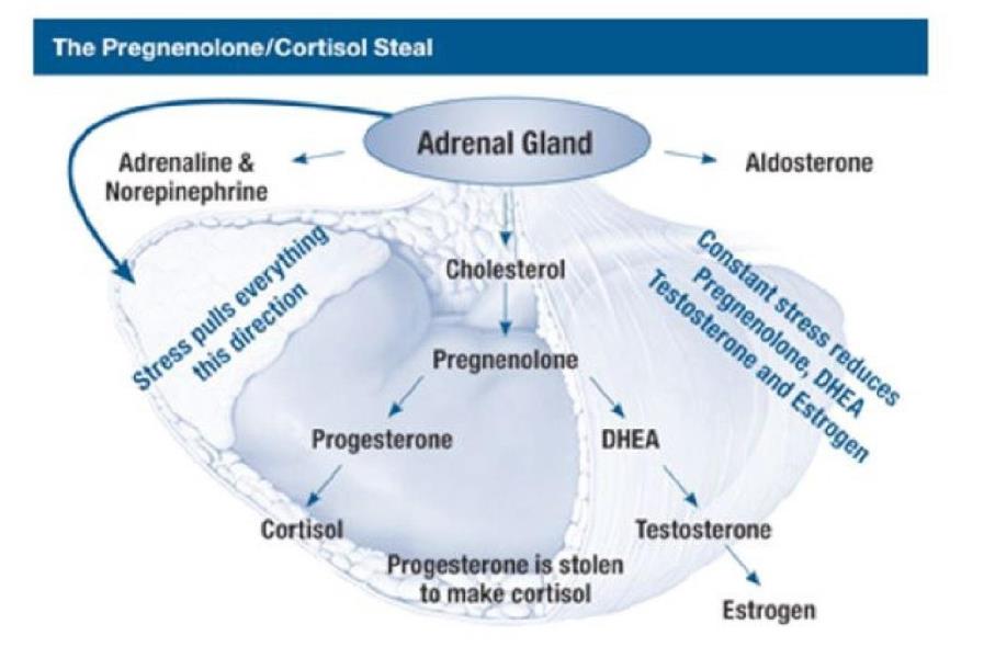 More cortisol is produced during stress, so when pregnenolone is siphoned from the pathway, male and female hormone production suffers, and this is known as the infamous “pregnenolone steal.” When hormones are out of balance, look to this important adrenal pathway and the effects of stress).